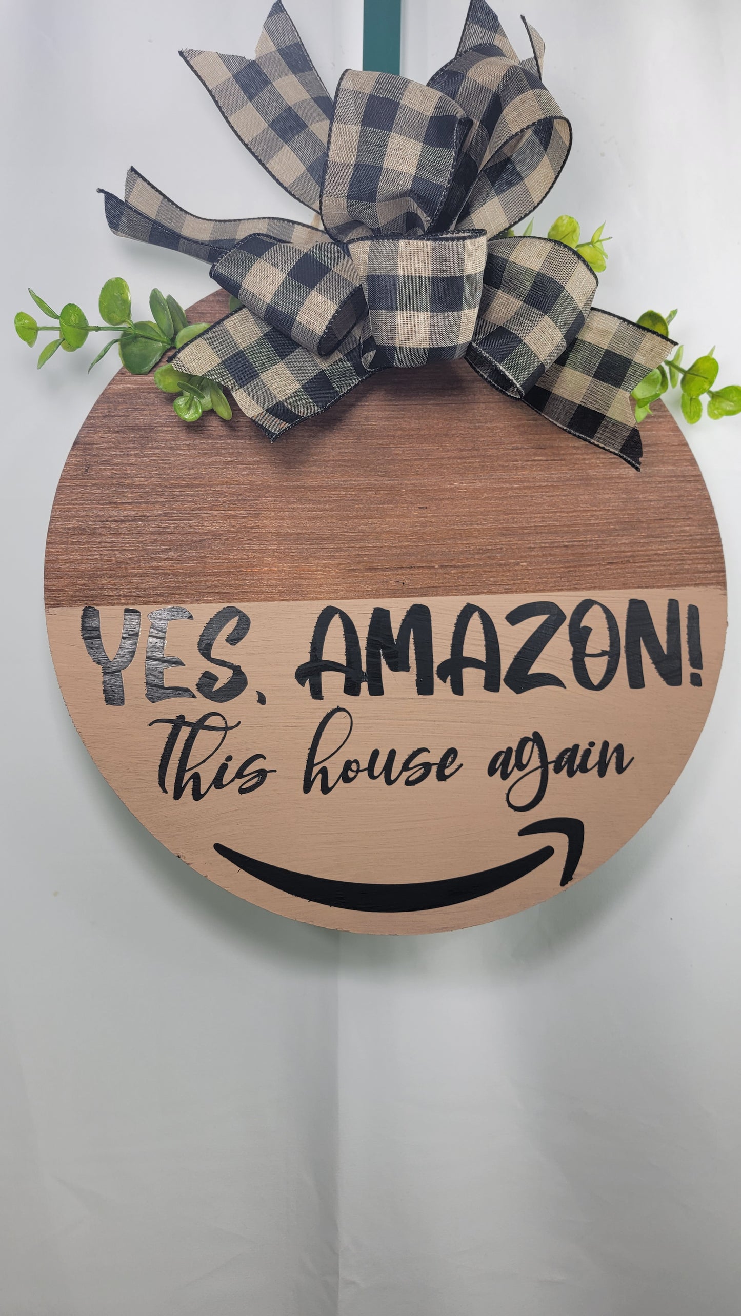 This 15 inch diameter Yes, Amazon this House Again door hanger is a humorous way to welcome visitors and deliveries. Handcrafted from wood and customized specifically for you, it is the perfect accessory for your front door.