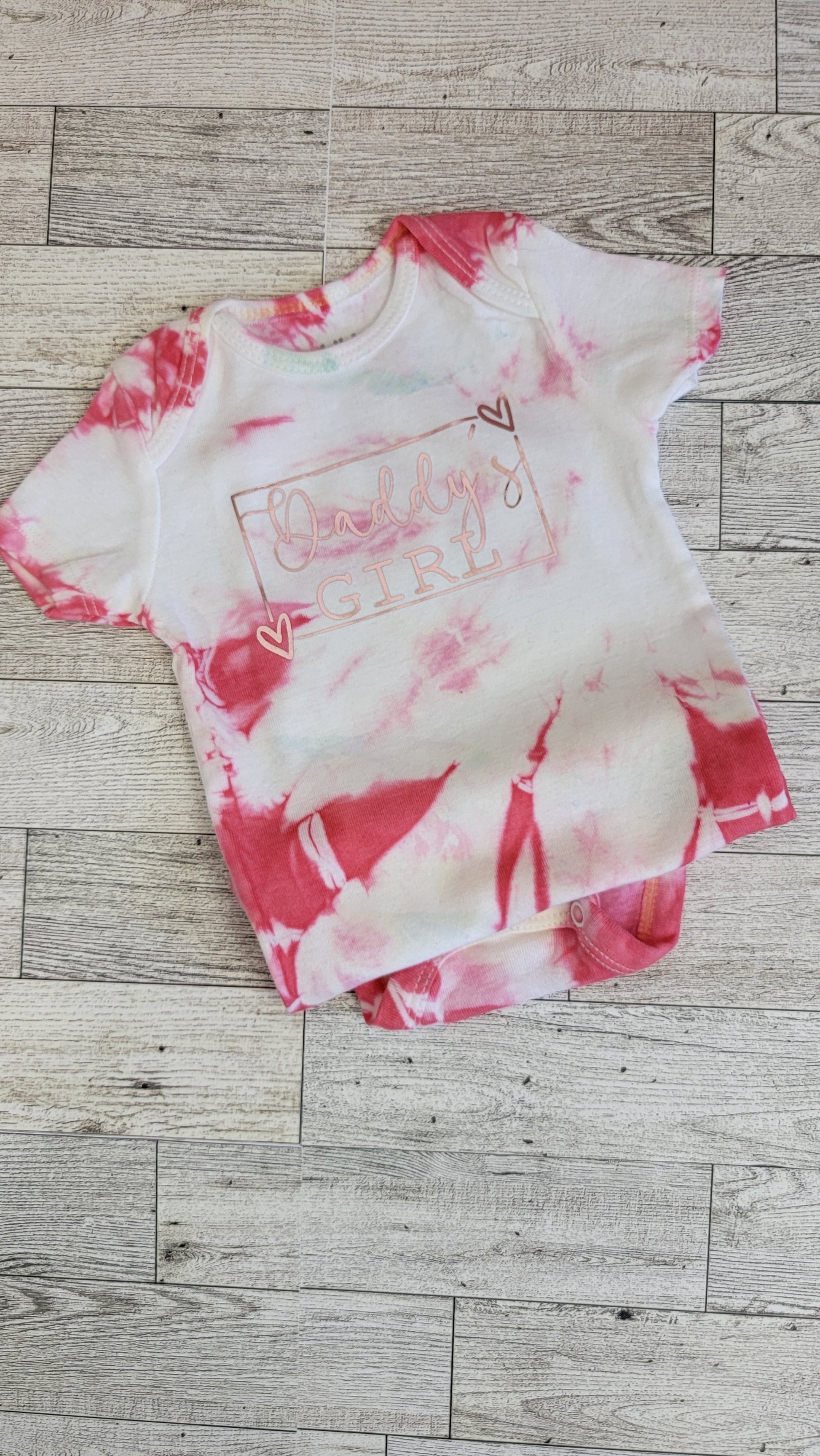 Tie dyed in pink but can be ordered in other tie dye colors or just White. Rose Gold metallic design.