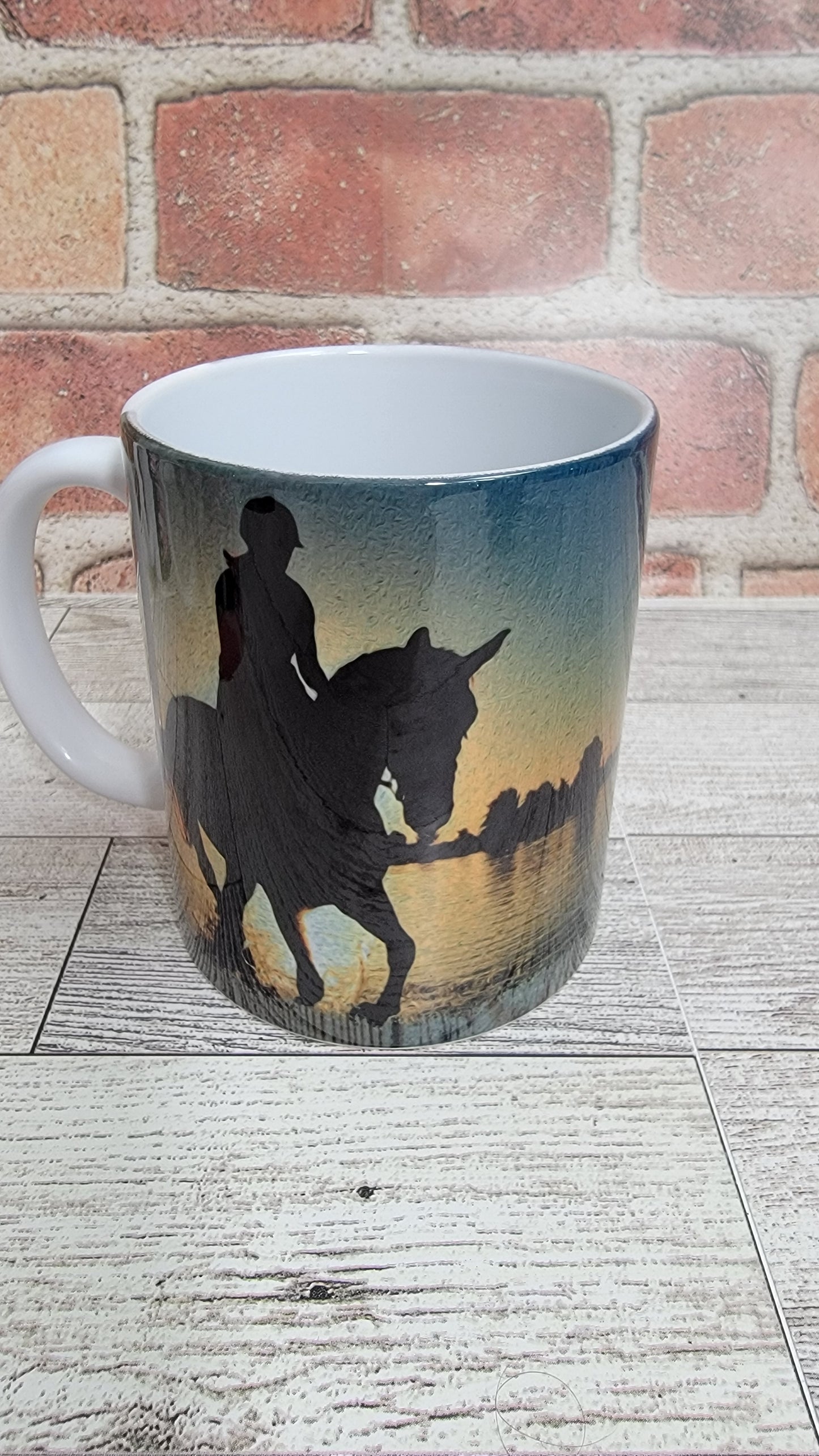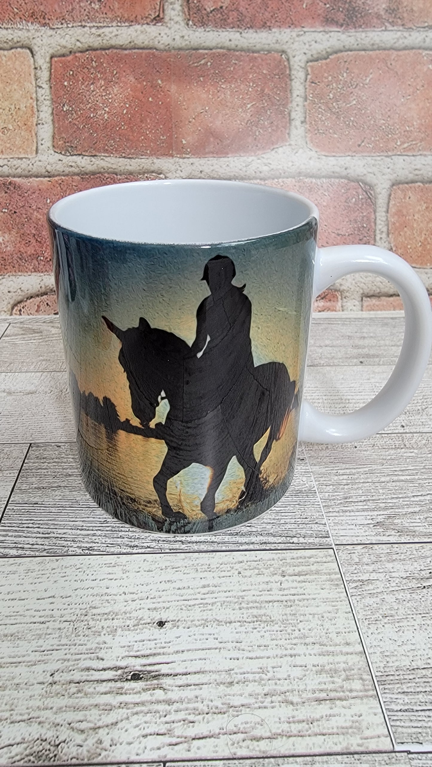 15 oz ceramic coffee mug with silhouette of a rider and horse at sunset.