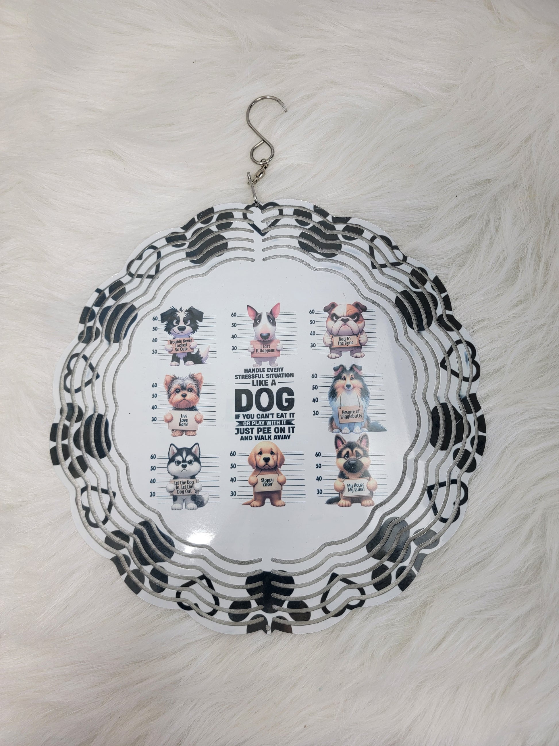 Upgrade your outdoor space with our Wind spinners! These artfully designed wind spinners add a touch of whimsy and color to any garden. Choose from a variety of playful graphic designs that will bring joy to your day. Perfect for anyone who loves to add a unique touch to their home! 10 inches in diameter, includes hook.