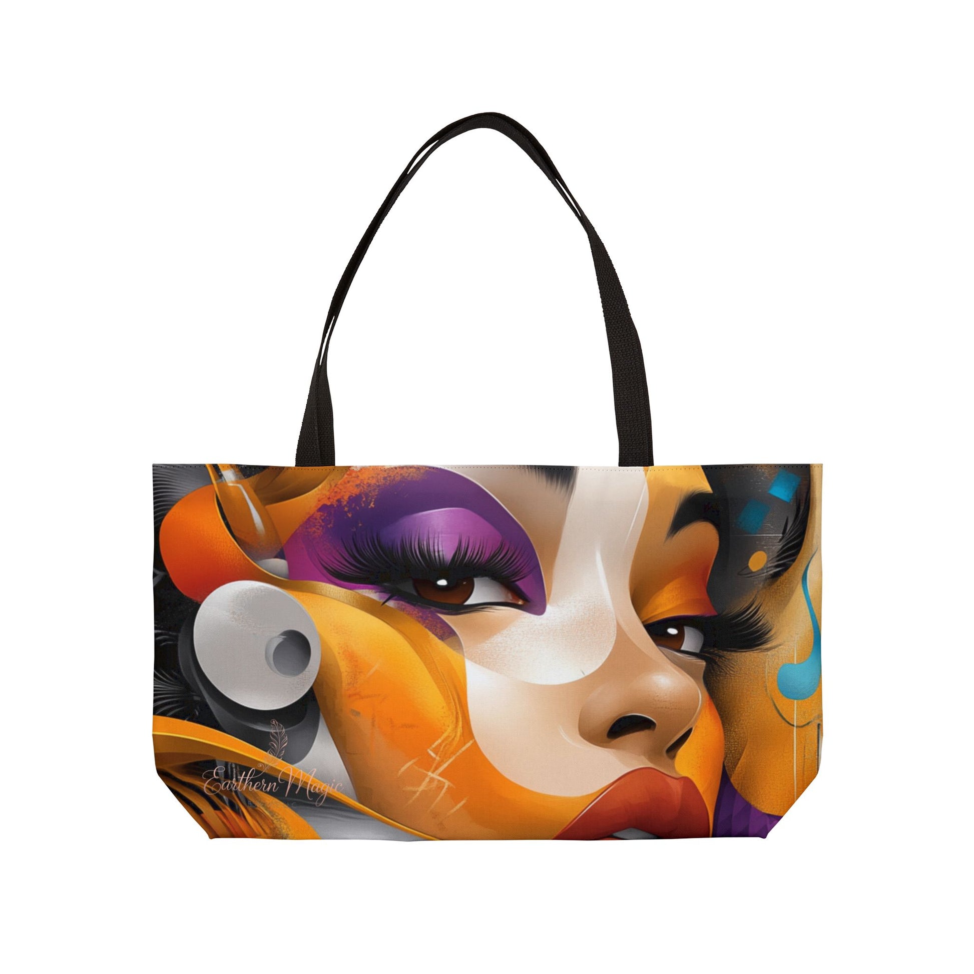 This multi-colored abstract art tote bag is perfect for the fashion-forward traveler looking to make a statement. With its vibrant colors and black woven handles, this tote bag is both stylish and functional. Ideal for African American art enthusiasts and those who appreciate unique, eye-catching designs. Great for travel, shopping, and everyday use.