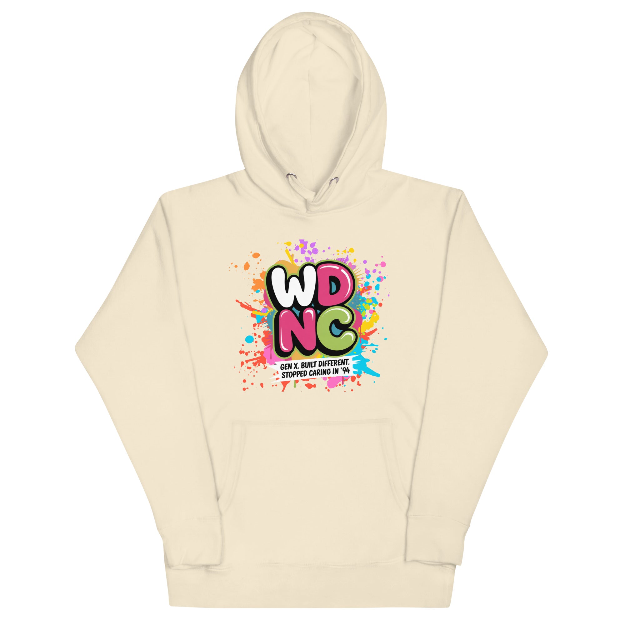 Featuring the bold acronym WDNC front and center, this hoodie keeps it real with a grunge-inspired aesthetic, perfect for everyday wear or that next throwback party. Soft, durable, and unapologetically honest—just like Gen X.