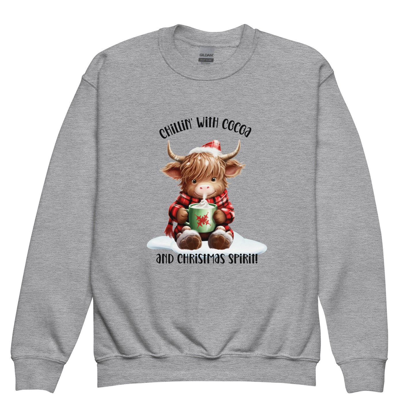 Stay cozy this holiday season with our Chillin/ with Cocoa and Christmas Spirit Youth crewneck sweatshirt! Featuring a fun and festive message, this sweatshirt is perfect for kids who love to spread Christmas cheer. Made with comfort in mind, it's the perfect addition to any winter wardrobe.