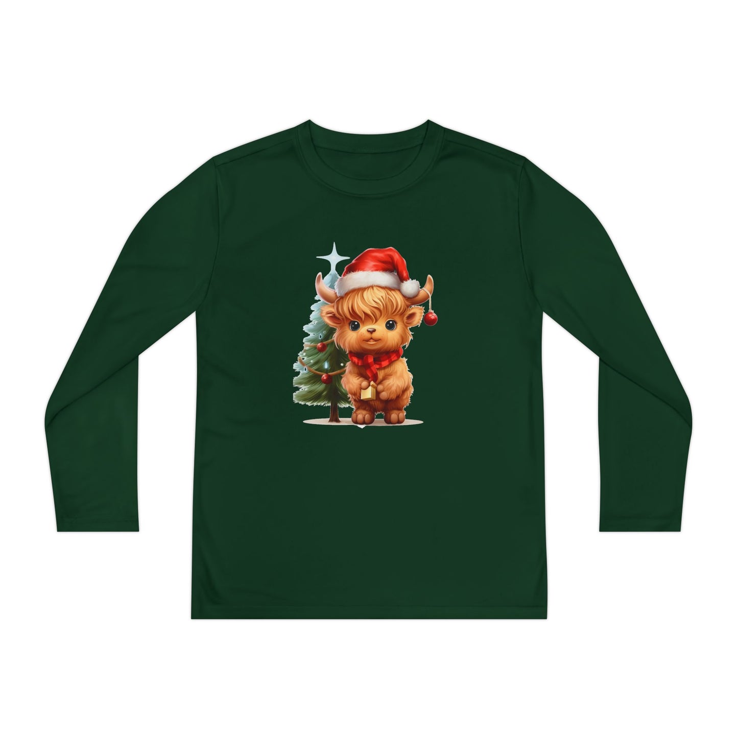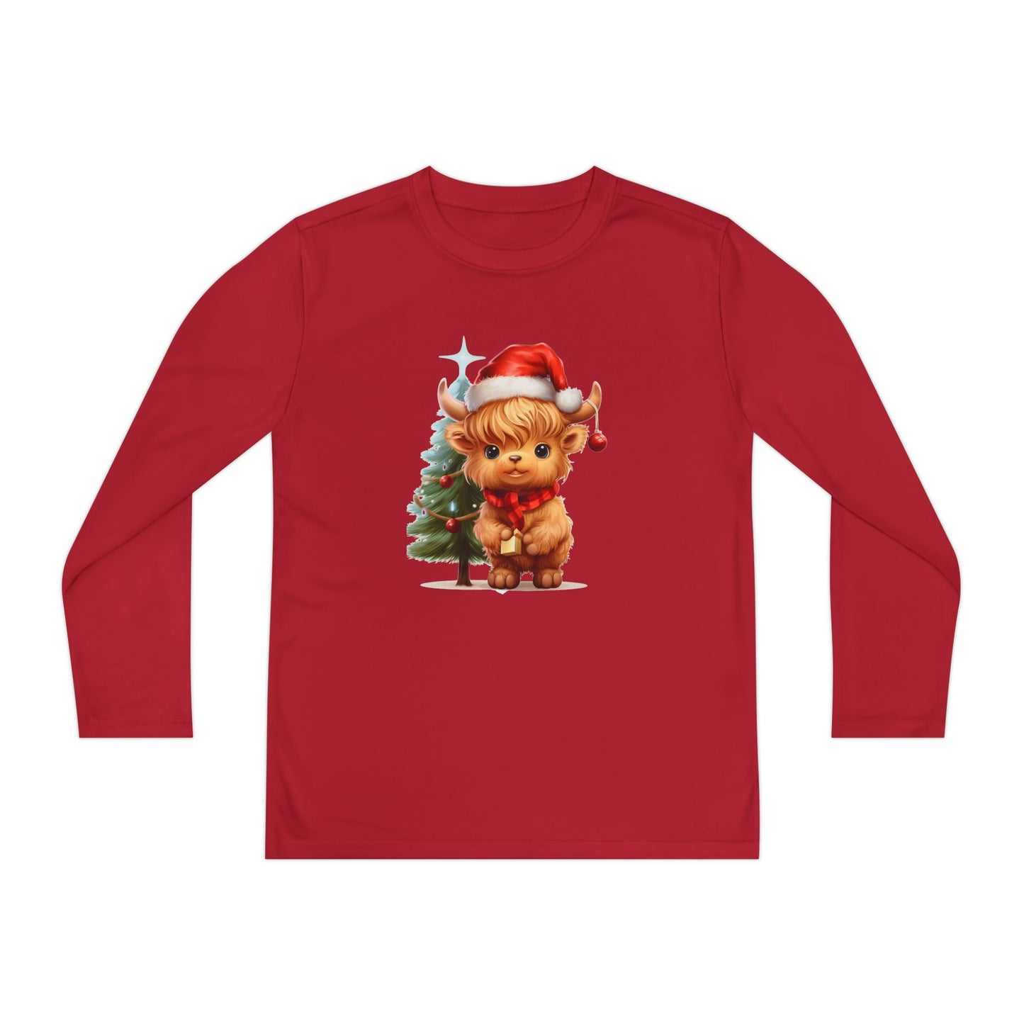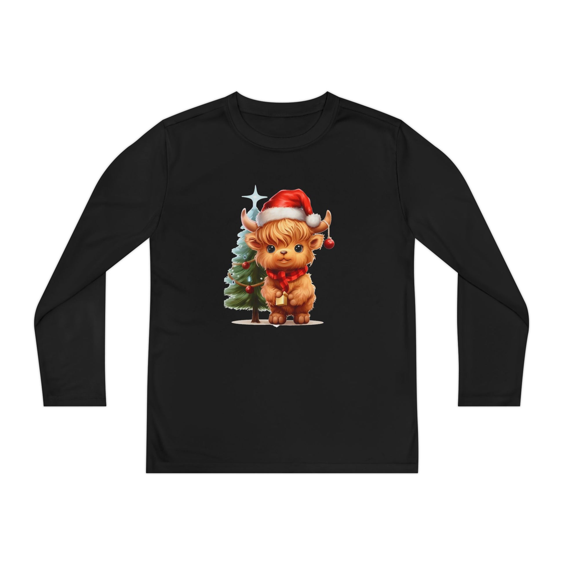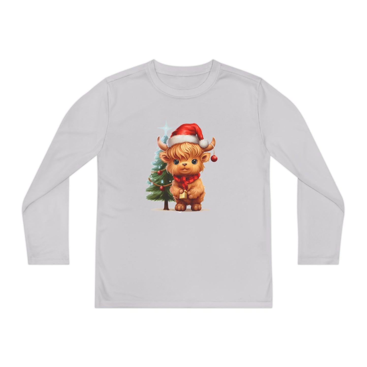 This Youth Long Sleeve Competitor Tee features a cute Highland cow with a Christmas tree design, perfect for the holiday season. Made of 100% moisture-wicking polyester, this athletic fit shirt is extra light and comfortable. It is ideal for active youth looking for a festive and comfortable shirt for Christmas celebrations.