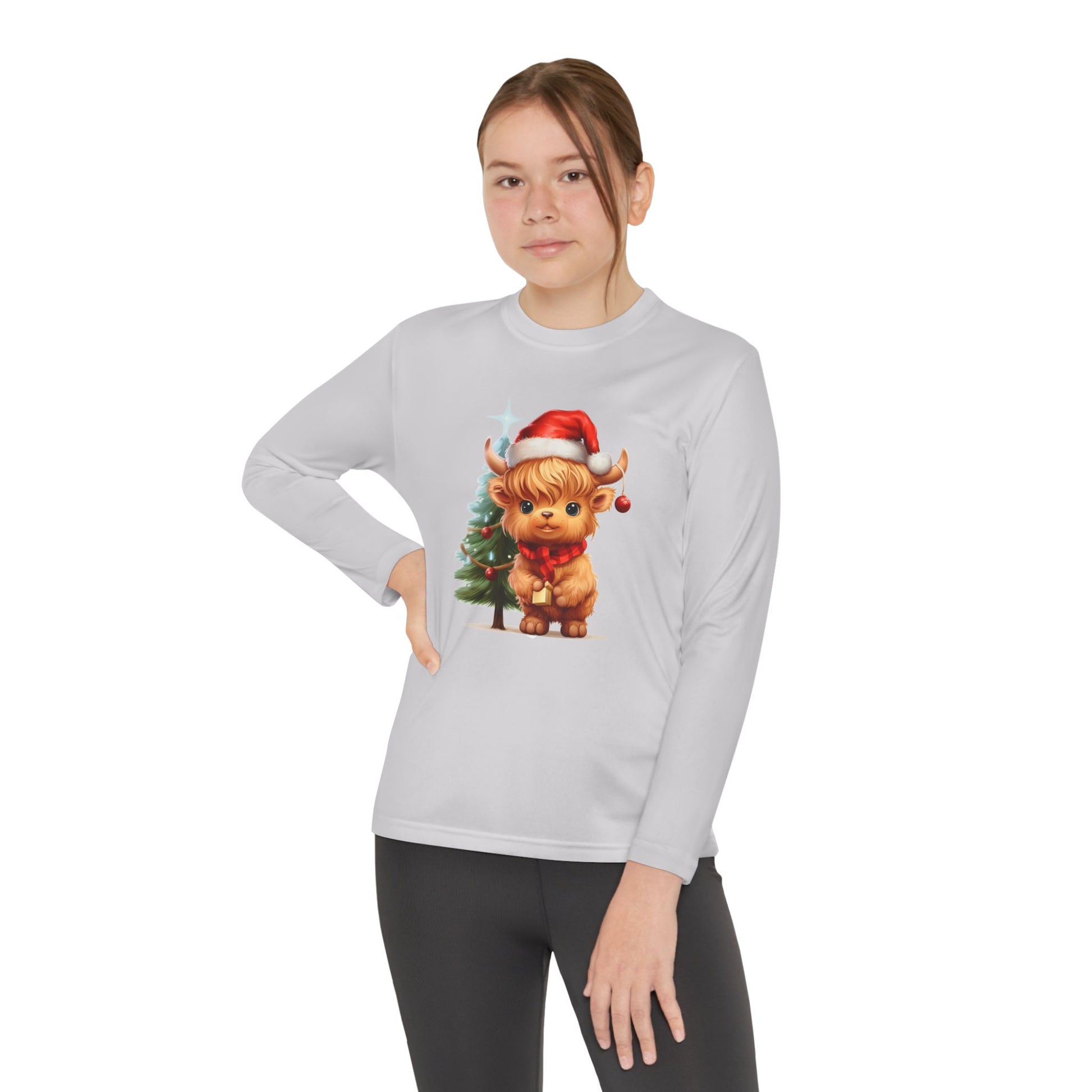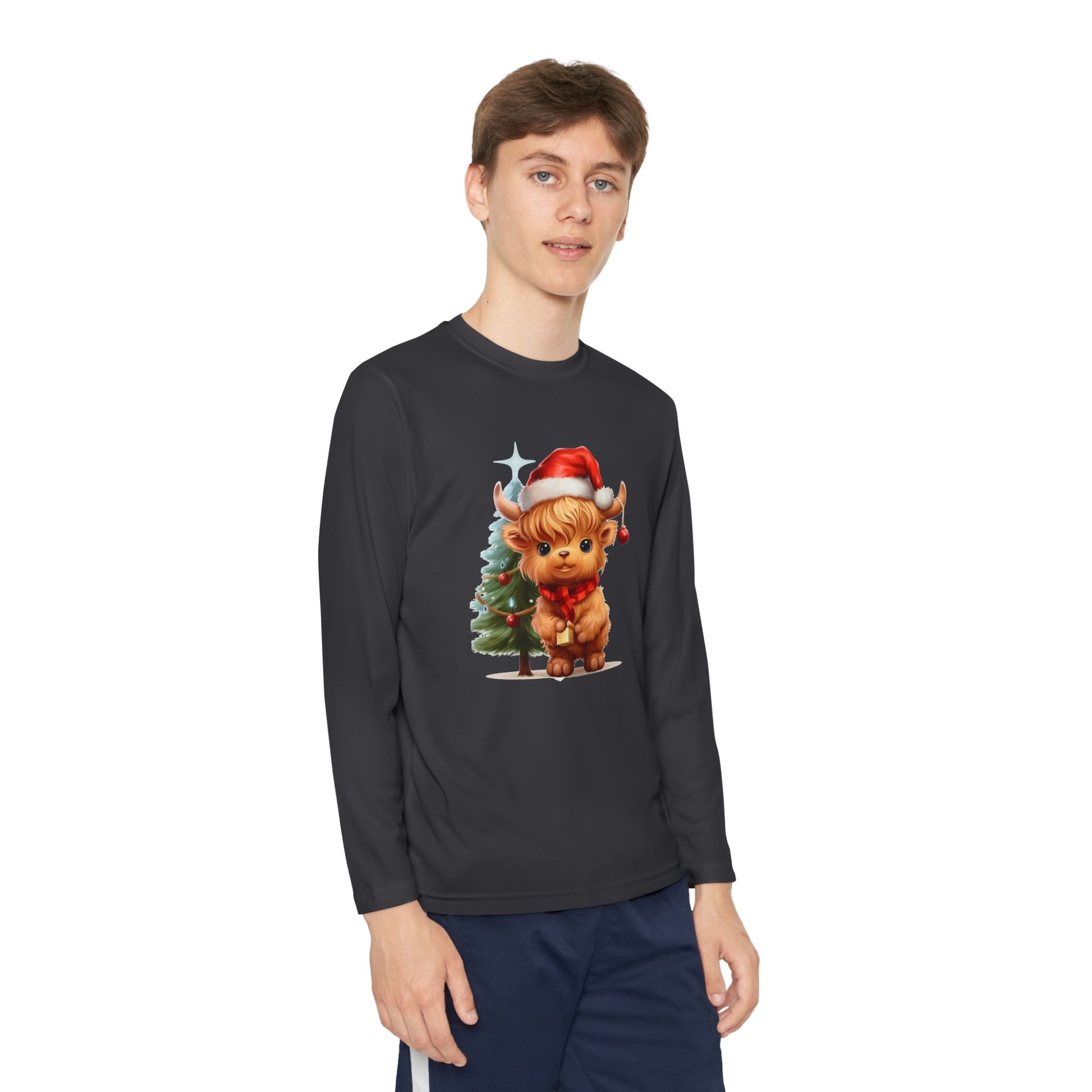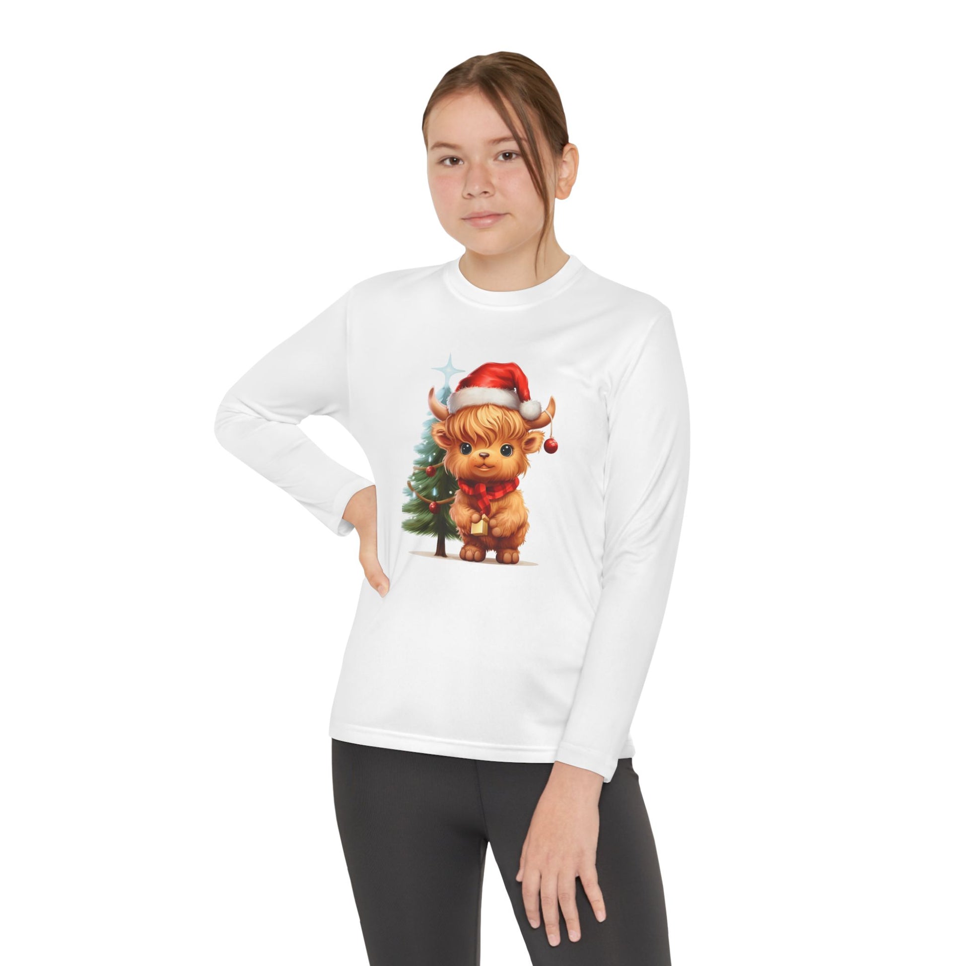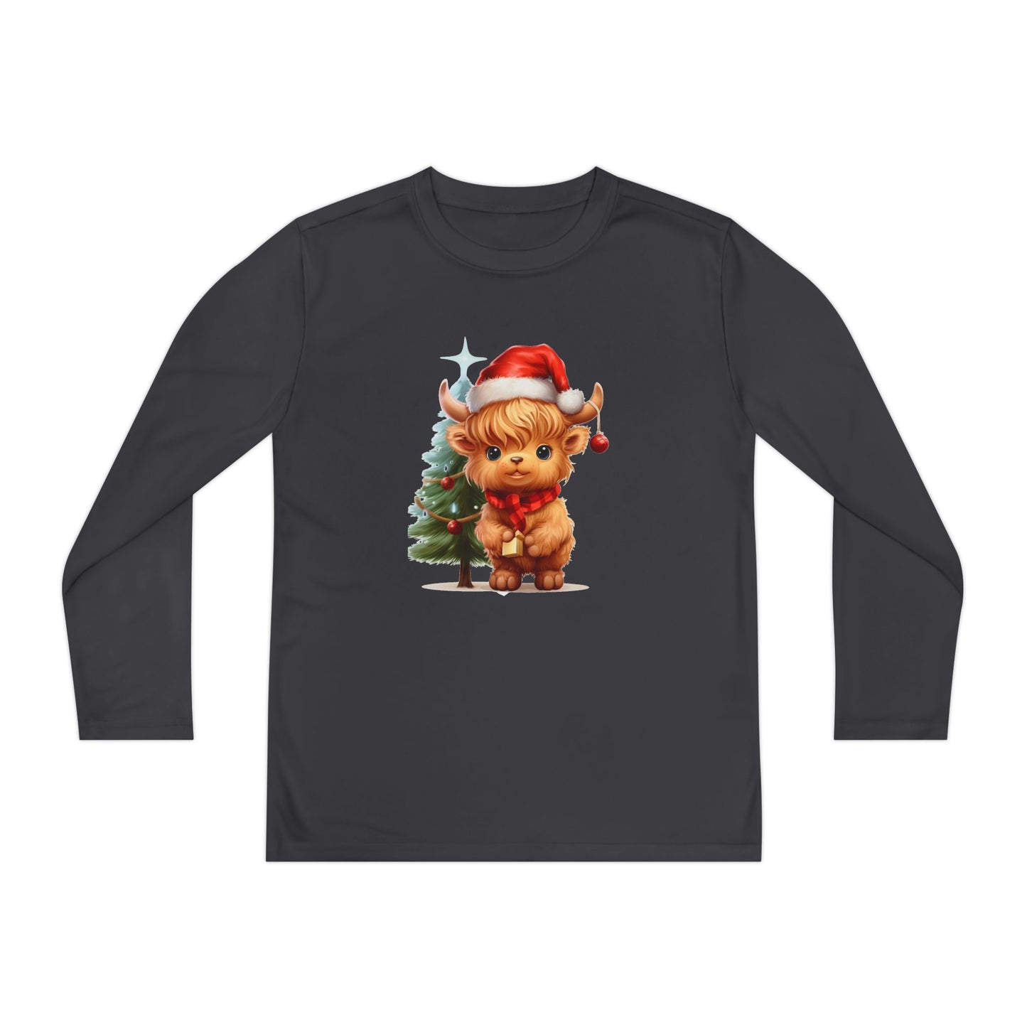This Youth Long Sleeve Competitor Tee features a cute Highland cow with a Christmas tree design, perfect for the holiday season. Made of 100% moisture-wicking polyester, this athletic fit shirt is extra light and comfortable. It is ideal for active youth looking for a festive and comfortable shirt for Christmas celebrations.